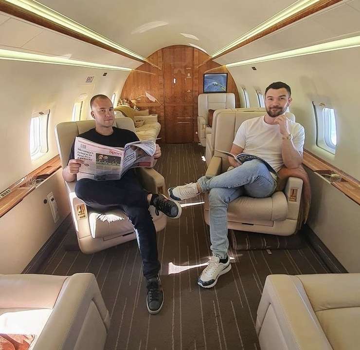 Horncastle and his Williams Corporation co-founder Blair Chappell aboard a private jet. The company paused its use of private jet travel as a signal of solidarity. Photo / Supplied